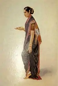 The Kaashtha sari (Marathi: नऊवारी साडी) is a style of sari draping is very similar to the way the Maharashtrian dhoti is worn. The word Kaashtha refers to the sari being tucked at the back.[1][2] Since this sari is usually worn by using a single nine yard cloth, it is also referred to as Nauvari which means Nine Yards.[3] Sakachcha sari is another term commonly used to refer to this style of sari.[4] It is referred to as Akanda Vastra, which means it doesn't need any other attire to support it. In fact, this attire holds utmost importance as women across different walks of life have worn it. It is not just worn at religious and cultural events, but women have fought wars in the past and still work in farmlands wearing this. [5]