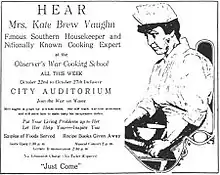In 1917 Vaughn worked in New York to test recipes compatible with wartime shortages and rationing. She taught how to make a Victory Cake eggless, sugarless, and butterless; she said someone once told her they were also "joyless", but then ate three pieces.[6]