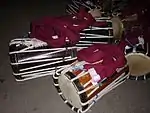 Many musical instruments are used in Kathakali. Three major drums found are Maddalam(barrel-shaped), Chenda (cylindrical drum played with curved sticks) and Idakka (Idakka, hourglass-shaped drum with muted and melodious notes played when female characters perform).[55]