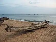 Kattumaram (கட்டுமரம்) is a traditional Tamil watercraft used in the Coast of Southern India, Sri Lanka, and Bangladesh,. They are characterized by being made from three to seven tree trunks tied together with fiber lashings and/or treenails.[1] The lashings are not permanent and the individual tree trunks are commonly separated to dry under the sun when kattumaram are beached. Most kattumaram are rafts because they are not watertight and rely on the buoyancy of the individual logs. However, some types of kattumaram known as teppa are watertight due to the addition polystyrene fillings on the hull and thus are true boats. They are propelled by oars, paddles, or lateen or lug sails. Modern versions of the kattumaram made from fibreglass are known as "fibre-teppa".[2]