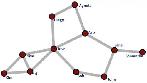 For example, in the figure on the right, assume that John's centrality is being measured and that . The weight assigned to each link that connects John with his immediate neighbors Jane and Bob will be . Since Jose connects to John indirectly through Bob, the weight assigned to this connection (composed of two links) will be . Similarly, the weight assigned to the connection between Agneta and John through Aziz and Jane will be and the weight assigned to the connection between Agneta and John through Diego, Jose and Bob will be .