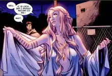 After Loki successfully has Thor exiled from Asgard, he manipulates Balder, now king, into moving Asgard to Latveria.[5] Kelda then informs Bill that she wishes to leave with her people and Bill decides to go with her.[6] In Latveria, Bill realizes that Loki has tricked Balder into moving Asgard to the home of Dr. Doom and warns Balder of his suspicions, which are overheard by three of Loki's followers. The three follow Bill outside to confront him, when Kelda appears and conjures a spear made of ice from a passing winter storm for Bill to use to defend himself. Kelda tells the three that spear is poisonous and one cut could kill, which cause them to flee.[7]