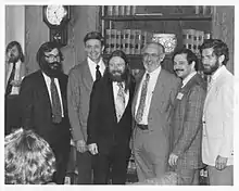In 1969, Iverson and the APL group inaugurated the IBM Philadelphia Scientific Center.[29][39] In 1970 he was named IBM Fellow.[49] He used the funding that came with being an IBM Fellow to bring in visiting teachers and professors from various fields, including Donald McIntyre from Pomona[28] and Jeff Shallit as a summer student.[24] For a period of several months the visitors would start using APL for expositions in their own fields, and the hope was that later they would continue their use of APL at their home institutions.[50] Iverson's work at this time centered in several disciplines, including collaborative projects in circuit theory, genetics, geology, and calculus.[51][52][53][54] When the PSC closed in 1974,[29][34] some of the group transferred to California while others including Iverson remained in the East, later transferring back to IBM Research. He received the Turing Award in 1979.[1]