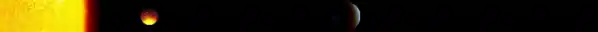 Kepler-10 is a G-type star, like the Sun. With a mass of 0.895 (± 0.06) Msun and a radius of 1.056 (± 0.021) Rsun, the star is approximately 10% less massive than and 5% wider than the Sun. The metallicity of Kepler-10, as measured in [Fe/H] (the amount of iron in the star), is -0.15 (± 0.04); this means that Kepler-10 is about 70% as metal-rich as the Sun. Metallicity tends to play a large role in the formation of planets, determining if they form, and what kind of planet they will form.[15] In addition, Kepler-10 is estimated to be 11.9 billion years old and to have an effective temperature of 5627 (± 44) K;[5] To compare, the Sun is younger and hotter, with an age of 4.6 billion years[16] and an effective temperature of 5778 K.[17]