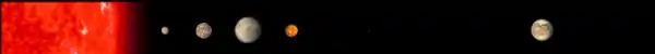 The star hosts four other planets discovered so far, although Kepler-186 b, c, d, and e (in order of increasing orbital radius), being too close to their star, are considered too hot to have liquid water. The four innermost planets are probably tidally locked, but Kepler-186f is in a higher orbit, where the star's tidal effects are much weaker, so the time could have been insufficient for its spin to slow down significantly. Because of the very slow evolution of red dwarfs, the age of the Kepler-186 system was poorly constrained, although it is likely to be greater than a few billion years.[19] Recent results have placed the age at around 4 billion years.[3] The chance that it is tidally locked is approximately 50%.[20] Since it is closer to its star than Earth is to the Sun, it will probably rotate much more slowly than Earth; its day could be weeks or months long (see Tidal effects on rotation rate, axial tilt and orbit).[21]