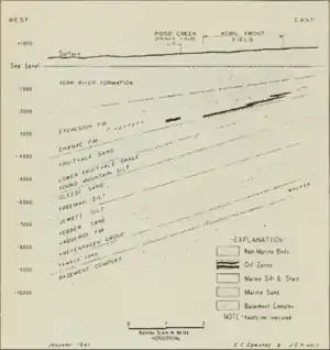 The Kern Front Field contains two major producing units, the Etchegoin Formation and the Chanac, both sedimentary, but unconformably overlain. The Etchegoin is a Pliocene marine sand, and the Chanac is a Pliocene non-marine sand. Each is interbedded with silts and clays, and the sands have a high porosity, ranging from 25-33 percent, making them singularly suitable as petroleum reservoirs. Overlying the Etchegoin and Chanac formations is the Pleistocene Kern River Formation, which is highly productive in the adjacent Kern River Oil Field. These units all have a northwest strike and a small southwest dip. A large north-trending fault on the east side of the field provides a structural seal on that side; on the northeast, the up-dip side of the field, the sands grade into relatively impermeable silts and clays, providing a seal in that direction. Many small southwest-trending faults run across the field. The California DOGGR recognizes only one producing pool – the Etchegoin-Chanac – and commingles the production data.[3][4]