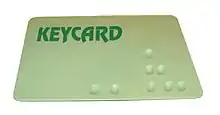 A keycard lock is a lock operated by a keycard, a flat, rectangular plastic card. The card typically, but not always, has identical dimensions to that of a credit card or American and EU driver's license. The card stores a physical or digital pattern that the door mechanism accepts before disengaging the lock.