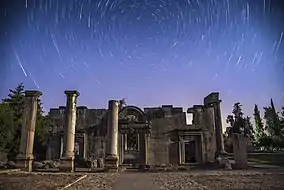 The synagogue is made of basalt stone, standard for most buildings in the area, and its façade faces south, towards Jerusalem, as the custom of most synagogues. The six-column portico is unusual.[11] The front entrance of the synagogue has three doorways that face Jerusalem. In front of the entrance are some of the (originally eight) columns with Attic bases which supported a porch. There is an inscription under the right window on the facade, which reads: "Banahu Elazar bar Yodan", which means "Elazar bar Yodan built it". Elazar bar Yodan is a Jewish Aramaic name. The interior of the synagogue was divided by rows of columns into three aisles and an ambulatory.