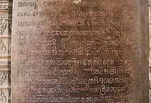 The Khmer script was adapted from the Pallava script, used in southern India and South East Asia during the 5th and 6th centuries AD,[4] which ultimately descended from the Tamil-Brahmi script,[5]. The oldest dated inscription in Khmer was found at Angkor Borei District in Takéo Province south of Phnom Penh and dates from 611.[6] Stelae of the Pre-Angkorean and Angkorean periods, featuring the Khmer script, have been found throughout the former Khmer Empire, from the Mekong Delta to what is now southern Laos, Northeast Thailand, and Central Thailand.[7]