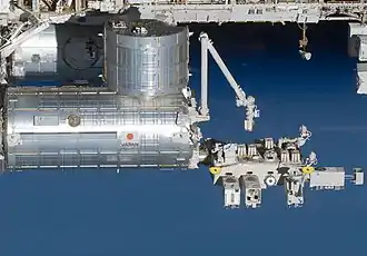 The Japanese Experiment Module (JEM), nicknamed Kibō (きぼう, Kibō, Hope), is a Japanese science module for the International Space Station (ISS) developed by JAXA. It is the largest single ISS module, and is attached to the Harmony module. The first two pieces of the module were launched on Space Shuttle missions STS-123 and STS-124. The third and final components were launched on STS-127.[1]