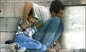 1500 hours. Everything has just erupted near the settlement of Netzarim in the Gaza Strip. The Palestinians have shot live bullets, the Israelis are responding. Paramedics, journalists, passersby are caught in the crossfire. Here, Jamal and his son Mohammed are the target of fire from the Israeli positions. Mohammed is twelve, his father is trying to protect him. He is motioning. Another burst of fire. Mohammed is dead and his father seriously wounded.[45]