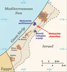 The Netzarim junction, where the shooting took place, is known locally as the al-Shohada (martyrs') junction. It lies on Saladin Road, a few kilometres south of Gaza City. The source of conflict at the junction was the nearby Netzarim settlement, where 60 Israeli families lived until Israel's withdrawal from Gaza in 2005. A military escort accompanied the settlers whenever they left or arrived at the settlement,[19] and an Israeli military outpost, Magen-3, guarded the approach. The area had been the scene of violent incidents in the days before the shooting.[19][20]
