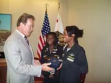 ![]() Anyadike (center) and sister Kelly meet California Governor Arnold Schwarzenegger. | |