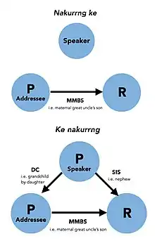 Terms of this type can be found in Murrinh-patha and Bininj Kunwok. The speaker and the addressee form two distinct propositi (P) who have unique relations to the referent (R). An example in Murrinh-patha is the term yilamarna. This term refers to the speaker's brother, who is also the uncle of the addressee; it is therefore also encoded in this term that the addressee is the child of the speaker. The term could be elaborated thus: