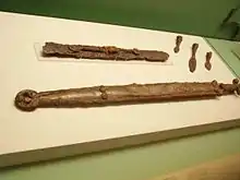 An important archaeological relic was found in 1987 during the excavation of a nearby Iron Age grave and dated to the 3rd century BC. The Kirkburn Sword, as it became known, is described by the British Museum as "probably the finest Iron Age sword in Europe". Its handle is made up of 37 pieces of iron, bronze and horn and decorated with red glass. Its scabbard is made of iron and polished bronze, decorated with a scroll pattern in La Tène style, with red glass studs and insets. Also in the British Museum are Celtic Iron Age finds from a chariot burial discovered only 11 yards (10 m) away from the man who was buried with the Kirkburn sword. They include an ornately decorated pair of linchpins from the axle.[5]