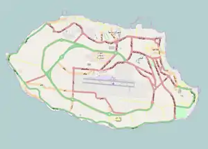 Kish is located in the Persian Gulf, 19 km (12 mi) from mainland Iran, and has an area of approximately 91 km2 (35 sq mi) with an outer boundary of 40 km (25 mi) and a nearly elliptical shape. Along Kish's coast are coral reefs and many other small islands. The island is positioned along the 1,359 km (844 mi) long Iranian coastline north of the Persian Gulf, at the first quarter from the Hormuz entrance to the Persian Gulf. The island is 15.45 km (9.60 mi) wide from its west coast to its east coast (the distance between Mariam Complex and Hoor field). Its maximum width extending from the southern shorelines to the northern shorelines is 7.5 km (4.7 mi) (the distance between Gomrok Port and the lighthouse). The island's surface is flat, lacking mountains or even high hills. Kish International Airport is built in the center on an elevated area 35–40 m (115–131 ft) above sea level. Its highest surface inclination extends from the airport to the shores near Shayan hotel.