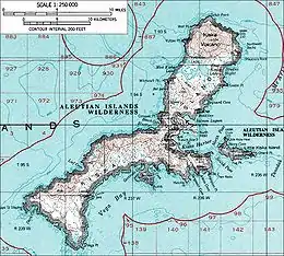 Kiska (Aleut: Qisxa,[1] Russian: Кыска) is one of the Rat Islands, a group of the Aleutian Islands of Alaska. It is about 22 miles (35 km) long and varies in width from 1.5 to 6 miles (2.4 to 9.7 km). It is part of Aleutian Islands Wilderness and as such, special permission is required to visit it.[2] The island has no permanent population.
