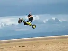 One of the more extreme manifestations of the sport is buggy jumping. This involves the pilot being physically attached—which is not the case for the other, more moderate kite buggying activities—to the buggy by means of a lap belt and the use of relatively large kites.