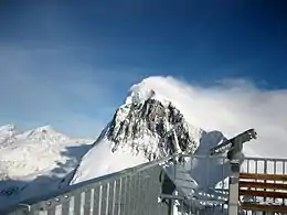 The Klein Matterhorn (sometimes translated as Little Matterhorn) is a peak of the Pennine Alps, overlooking Zermatt in the Swiss canton of Valais. At 3,883 metres (12,740 ft) above sea level, it is the highest place in Europe that can be reached by aerial tramway or gondola lift, as well as by any other means of transport. The Klein Matterhorn is part of the Breithorn massif and overlooks on its south side the almost equally high flat glacier named Breithorn Plateau, just north of the international border with Italy. The name "Klein Matterhorn" is a reference to its much larger neighbour, the Matterhorn, which lies 7 km (4.3 mi) away across the Theodul Pass.