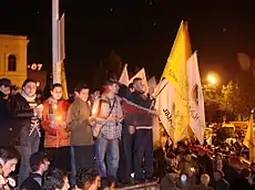 Kmara remained at the forefront of the mass rallies following the November 2003 parliamentary election, which was criticized by the opposition, NGOs and international observers. After the demonstrations brought about the resignation of Shevradnadze, Kmara shifted its focus in Adjara, a southwestern autonomous republic ran by Aslan Abashidze. The movement was continuously harassed by the Adjarian regime,[8] which, in its turn, fell to the increasing pressure from the new Georgian government of Mikheil Saakashvili.[9]