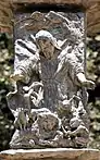 The prophet Isaiah, placed on the opposite branch from Jeremiah on the Menorah, lived shortly before him. His prophecies include multiple verses of comfort and descriptions of the End of Days. One of his prophecies is: "The wolf will live with the lamb, the leopard will lie down with the goat, the calf and the lion and the yearling[a] together; and a little child will lead them. The cow will feed with the bear, their young will lie down together, and the lion will eat straw like the ox. The infant will play near the cobra’s den, and the young child will put its hand into the viper’s nest. They will neither harm nor destroy on all my holy mountain, for the earth will be filled with the knowledge of the Lord as the waters cover the sea." (Isaiah, XI, FH). In the relief Isaiah is standing, hands spread out, behind him light rays that symbolize his prophetic vision. At his feet, is the realization of his prophecy: a wolf hugging a lamb, a lion and a little calf. To the right, a child is playing with a snake, the entire relief represents an idyll.