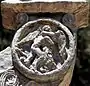 Opposite of Bar Kochba is the relief of young David after defeating Goliath. David holding aloft the severed head of Goliath, behind him his is harp on which the royal cape and crown are hung. At Davids' feet, is Goliath's dagger. David represents the triumph of the simple truth over the strength of the armor.