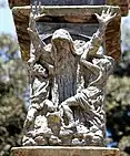 Jeremiah, also known as the "prophet of destruction" lived in Jerusalem during its fall in the hands of Nebuchadnezzar, king of Babylon. In the relief, he is shown shouting and grieving for the ruined city, and the wickedness of his people. His arms are outstretched above, one clenched in a fist, in the background are the shattered towers of Jerusalem.