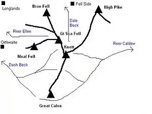 Skiddaw and Blencathra are the best known of the Northern Fells, fronting the range as they loom above Keswick and the road to Penrith. Behind this wall is a further group of fells, commonly referred to as Back o' Skiddaw.[1][2] Knott stands at the centre of this group, in addition to being the highest point.