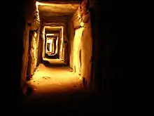 A historical reference to the cave is to be found in the Triads of Ireland, dating from the 14th to the 19th century, where "Úam Chnogba, Úam Slángæ and Dearc Fearna" are listed under the heading, "the three darkest places in Ireland".[5] The last, meaning the "Cave of the Alders", is generally thought to be the present Dunmore Cave,[6] while the first two translate as the caves of Knowth and the caves of Slaney.[7] It is not known which exact system of caves/passage tombs near the river Slaney is being referred to, with the most likely being those at Baltinglass. Other sources translate the listed locations as Rath Croghan, the cave or crypt of Slane[8] and the "Cave of the Ferns".[7]