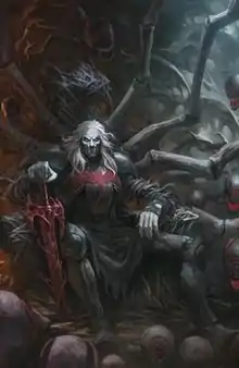 Knull possesses superhuman strength and durability.[34][35][36] He is depicted as an immortal being.[37][6] He is able to generate and manipulate eldritch darkness, as he can manifest darkness to create weapons and living creatures, whom he calls the "Living abyss."[38][39][40][41] He is able to forge different types symbiotes with various abilities, such as dragon-like symbiotes.[42][43] He can remotely influence and control the symbiotes he creates.[44] Knull is also a shapeshifter, being able to turn his human-like mouth into fanged jaws with an elongated tongue — a feature passed on to the symbiotes.[45] With his regenerative healing factor, Knull can recover quickly from injuries.[46] Knull also has the ability to fly.[47]