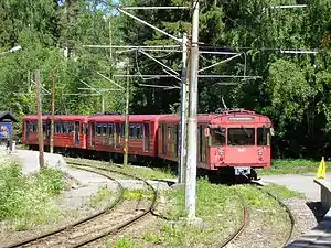 At Øraker the Lilleaker Line meets the Kolsås Line, after which point the lines share tracks.[3] The line crosses the municipal border across the river Lysakerelven. The now closed station of Lysakerelven, 8.4 kilometers (5.2 mi) from Stortinget, was situated on the Bærum side of the municipal border between Oslo and Bærum.[4] At Jar there are two sets of platforms, one for the metro and one for the trams. The continues past Ringstabekk, which is only served by the metro. It replaced three disused stations, Tjernsrud, Ringstabek and Egne hjem.[3] Situated 11.4 kilometers (7.1 mi) from Stortinget,[4] Bekkestua is the terminal station for the tramway, and a major transit hub for central Bærum. Like Jar, it features two sets of different platforms. The shared rail section features both third-rail power supply and overhead wires. The trams have a narrower loading gauge and shorter platforms, making it necessary to provide separate platforms for them.[3]