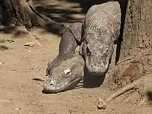 Mating occurs between May and August, with the eggs laid in September.[5][60] During this period, males fight over females and territory by grappling with one another upon their hind legs, with the loser eventually being pinned to the ground. These males may vomit or defecate when preparing for the fight.[35] The winner of the fight will then flick his long tongue at the female to gain information about her receptivity.[41] Females are antagonistic and resist with their claws and teeth during the early phases of courtship. Therefore, the male must fully restrain the female during coitus to avoid being hurt. Other courtship displays include males rubbing their chins on the female, hard scratches to the back, and licking.[61] Copulation occurs when the male inserts one of his hemipenes into the female's cloaca.[36] Komodo dragons may be monogamous and form "pair bonds", a rare behavior for lizards.[35]