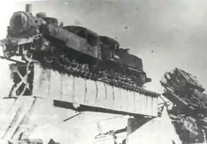 Other new construction took place prior to 1950, but the Korean War which broke out on 25 June 1950 interrupted progress. Initially, the Korean People's Army was dominant, occupying most of the Korean Peninsula apart from a small pocket around Pusan; during this time, many railway vehicles, such as DeRoI-class electric locomotives and steam locomotives built in Japan after the end of the war and delivered to South Korea as reparations, were taken to North Korea.[6] At the same time, war aid in the form of locomotives and freight cars arrived from friendly socialist countries such as the USSR, China, Poland, Hungary, and Czechoslovakia.[15] American-led United Nations forces quickly turned the tide of the war, however; by 19 October of the same year had captured P'yŏngyang,[16] and a week later, South Korean troops reached the Yalu River. Throughout the Korean War, much of the railway infrastructure and many of the locomotives were destroyed. On 31 December 1950, a train, consisting of the locomotive Matei 10 and 25 cars, going from Hanp'o to Munsan was ordered to stop at Changdan by the US Army, and was destroyed;[15] the track was also destroyed, after which the Kyŏngŭi Line remained severed for over 50 years. UN forces were quickly pushed back south of the 38th parallel, and by the end of the year the war had become a stalemate; little exchange of territory happened over the next two years of fighting until the Korean Armistice Agreement was signed on 27 July 1953.[17]