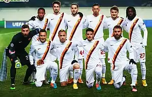 Manolas scored his first goal for Olympiacos in the 2013–14 UEFA Champions League in a 1–0 home win against Benfica, building the foundations for the next round.[19] He scored his second goal in the Champions League in a 2–1 away loss against Paris Saint-Germain,[20] though nonetheless the squad secured a spot in the round of 16—the first time the club had reached the stage since 2009–10—in matchup against Manchester United. With United failing to display their usual dominant domestic form that term, Manolas thought the Greek champions had what it takes to make the Champions League quarter-finals for only the second time: "I believe we will give a good performance. I hope Manchester United will not get better than they are now, so we can defeat them."[21] Despite winning the first leg 2–0 at home, Olympiacos fell as Manchester United's Robin van Persie hit a hat-trick in the return leg in Manchester to progress 3–2 on aggregate.[22]