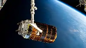 ![]() H-II Transfer Vehicle (HTV-8) being grappled by the Canadarm2 on 1 November 2019. | |