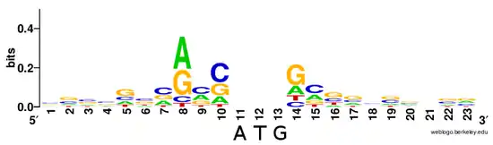 The AUG is the initiation codon encoding a methionine amino acid at the N-terminus of the protein. (Rarely, GUG is used as an initiation codon, but methionine is still the first amino acid as it is the met-tRNA in the initiation complex that binds to the mRNA). Variation within the Kozak sequence alters the "strength" thereof. Kozak sequence strength refers to the favorability of initiation, affecting how much protein is synthesized from a given mRNA.[4][9] The A nucleotide of the "AUG" is delineated as +1 in mRNA sequences with the preceding base being labeled as −1. For a 'strong' consensus, the nucleotides at positions +4 (i.e. G in the consensus) and −3 (i.e. either A or G in the consensus) relative to the +1 nucleotide must both match the consensus (there is no 0 position). An 'adequate' consensus has only 1 of these sites, while a 'weak' consensus has neither. The cc at −1 and −2 are not as conserved, but contribute to the overall strength.[10] There is also evidence that a G in the -6 position is important in the initiation of translation.[4] While the +4 and the −3 positions in the Kozak sequence have the greatest relative importance in the establishing a favorable initiation context a CC or AA motif at −2 and −1 were found to be important in the initiation of translation in tobacco and maize plants.[11] Protein synthesis in yeast was found to be highly affected by composition of the Kozak sequence in yeast, with adenine enrichment resulting in higher levels of gene expression.[12] A suboptimal Kozak sequence can allow for PIC to scan past the first AUG site and start initiation at a downstream AUG codon.[13][2]