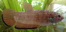 The Krabi mouth-brooding betta is an oblong fish with rounded fins, growing to a length of about 8 cm (3 in). The basic colour is yellowish-brown or greyish-brown with three faint longitudinal stripes. The gill-cover has a bluish-green patch and the fins have a blue iridescence. The pelvic fins are short and the anal fin long, with a dark margin. The caudal-fin is rounded and undivided.[2]
