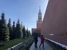 The Kremlin Wall Necropolis is the former national cemetery of the Soviet Union, located in Red Square in Moscow beside the Kremlin Wall.[1] Burials there began in November 1917, when 240 pro-Bolsheviks who died during the Moscow Bolshevik Uprising were buried in mass graves. The improvised burial site gradually transformed into the centerpiece of military and civilian honor during the Second World War. It is centered on Lenin's Mausoleum, initially built in wood in 1924 and rebuilt in granite in 1929–1930. After the last mass burial in Red Square in 1921, funerals there were usually conducted as state ceremonies and reserved as the final honor for highly venerated politicians, military leaders, cosmonauts, and scientists. In 1925–1927, burials in the ground were stopped; funerals were now conducted as burials of cremated ash in the Kremlin wall itself. Burials in the ground resumed with Mikhail Kalinin's funeral in 1946.