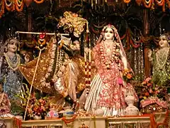 Other legends describe him as an enchanter and playful lover of the gopis (milkmaids) of Vrindavana, especially Radha. These metaphor-filled love stories are known as the Rasa lila and were romanticized in the poetry of Jayadeva, author of the Gita Govinda. They are also central to the development of the Krishna bhakti traditions worshiping Radha Krishna.[116]