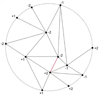 The following description illustrates the induction step for . In this case is a disc and its boundary is a circle. The labeling L is boundary-odd, so in particular for some point v on the boundary. Split the boundary circle to two semi-circles and treat each semi-circle as an interval. By the induction basis, this interval must have an alternating simplex, e.g. an edge with labels (+1,−2). Moreover, the number of such edges on both intervals is odd. Using the boundary criterion, on the boundary we have an odd number of edges where the smaller number is positive and the larger negative, and an odd number of edges where the smaller number is negative and the larger positive. We call the former decreasing, the latter increasing.