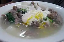 Kyay oh (Burmese: ကြေးအိုး; pronounced [t͡ɕéʔó]) is a popular noodle soup made with pork and egg in Burmese cuisine. Fish and chicken versions are also made as well as a "dry" version without broth. Kyay oh is traditionally served in a copper pot.[1] Kyay oh is made with rice noodles (rice vermicelli or flat rice noodles) and marinated meatballs. The broth is made with pork, chicken, or fish. The pork version, the most popular, uses pork bones and intestine. Kyay oh is typically served with a tomato and green pepper sauce.[2]