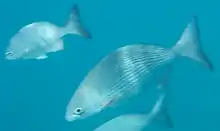 Kyphosus sectatrix, the Bermuda chub, Pacific drummer, beaked chub, grey drummer, Pacific chub or white chub, is a species of marine ray-finned fish, a sea chub from the family Kyphosidae. This species is found in tropical and subtropical coastal waters worldwide. It has had a confused taxonomic history dating back to Linnaeus's naming of the species in 1758.