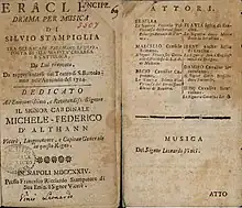 ![]() Frontispiece and cast from the libretto of the 1724 Naples premiere of l'Eraclea by Leonardo Vinci | |