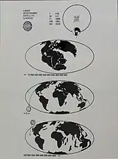 LAGEOS-1 (which is predicted to re-enter the atmosphere in 8.4 million years[6]) also contains a 4 in × 7 in plaque designed by Carl Sagan[9] to indicate to future humanity when LAGEOS-1 was launched. The plaque includes the numbers 1 to 10 in binary. In the upper right is a diagram of the Earth orbiting the Sun, with a binary number 1 indicating one revolution, equaling one year. It then shows 268,435,456 years in the past (binary: 228), indicated by a left arrow and the arrangement of the Earth's continents at that time (during the Permian period). The present arrangement of the Earth's continents is indicated with a 0 and both forward and backward arrows. Then the estimated arrangement of the continents in 8.4 million years with a right facing arrow and 8,388,608 in binary (223). LAGEOS itself is shown at launch on the 0 year, and falling to the Earth in the 8.4 million year diagram.[10][11]