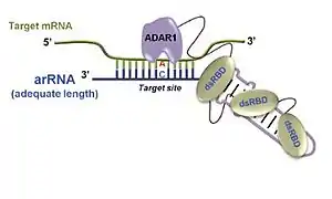 As opposed to DNA gene editing techniques (e.g., using CRISPR-Cas proteins to make modifications directly to a defective gene), LEAPER targets editing messenger RNA (mRNA) for the same gene which is transcribed into a protein.[3] Post-transcriptional RNA modification typically involves the strategy of converting adenosine-to-inosine (A-to-I) since inosine (I) demonstrably mimics guanosine (G) during translation into a protein. A-to-I editing is catalyzed by adenosine deaminase acting on RNA (ADAR) enzymes, whose substrates are double-stranded RNAs.[4] Three human ADAR genes have been identified with ADAR1 (official symbol ADAR) and ADAR2 (ADARB1) proteins developed activity profiles. LEAPER achieves this targeted RNA editing through the use of short engineered ADAR-recruiting RNAs (arRNAs). arRNAs consist of endogenous ADAR1 proteins with several RNA binding domains (RBDs) fused with a peptide, CRISPR-Cas13b protein, and a guide RNA (gRNA) between 100 and 150 nt in length for high editing efficiency designed to recruit the chimeric ADAR protein to a target site.[2]