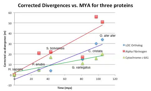The corrected divergences graph above shows three lines: Alpha Fibrinogen in Red, LOC Ortholog (aka LOC105377021) in blue, and Cytochrome c 6A1 in green. These lines associate with evolutionary pace in LOC105377021, as tested using a corrected divergence genomic analysis.