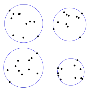 - The smallest circle problem is the problem of finding the minimum radius of a circle containing a given set of n points in the plane. It satisfies monotonicity (adding more points can only make the circle larger) and locality (if the smallest circle for set A contains B and x, then the same circle also contains B ∪ {x}). Because the smallest circle is always determined by some three points, the smallest circle problem has combinatorial dimension three, even though it is defined using two-dimensional Euclidean geometry.[2] More generally, the smallest enclosing ball of points in d dimensions forms an LP-type problem of combinatorial dimension d + 1. The smallest circle problem can be generalized to the smallest ball enclosing a set of balls,[3] to the smallest ball that touches or surrounds each of a set of balls,[4] to the weighted 1-center problem,[5] or to similar smaller enclosing ball problems in non-Euclidean spaces such as the space with distances defined by Bregman divergence.[6] The related problem of finding the smallest enclosing ellipsoid is also an LP-type problem, but with a larger combinatorial dimension, d(d + 3)/2.[7]