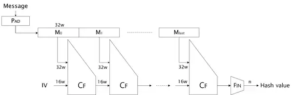 The hash function LSH has the wide-pipe Merkle-Damgård structure with one-zeros padding. The message hashing process of LSH consists of the following three stages.