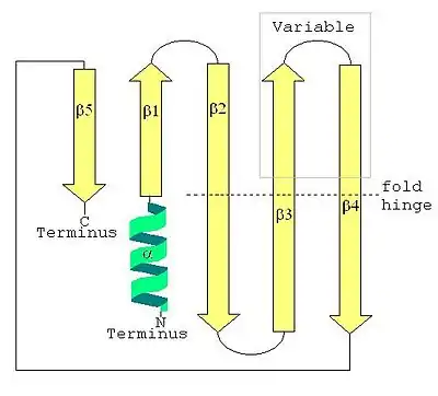 The SH3-type barrel tertiary structure of the LSm fold is formed by the strongly bent (about 120°) β2, β3 and β4 strands, with the barrel structure closed by the β5 strand. Emphasizing the tertiary structure, each bent beta strand can be described as two shorter beta strands. The LSm fold can be viewed as an eight-strand anti-parallel beta sandwich, with five strands in one plane and three strands in a parallel plane with about a 45° pitch angle between the two halves of the beta sandwich. The short (two to four turns) N-terminal alpha helix occurs at one edge of the beta sandwich. This alpha helix and the beta strands can be labeled (from the N-terminus to the C-terminus) α, β1, β2a, β2b, β3a, β3b, β4a, β4b, β5 where the a and b refer to either the two halves of a bent strand in the five-strand description, or to the individual strands in the eight-strand description. Each strand (in the eight-strand description) is formed from five amino acid residues. Including the bends and loops between the strands, and the alpha helix, about 60 amino acid residues contribute to the LSm fold, but this varies between homologs due to variation in inter-strand loops, the alpha helix, and even the lengths of β3b and β4a strands.