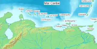 Blanquilla is an island, one of the Federal Dependencies of Venezuela,[1] located in the southeastern Caribbean Sea about 293 km (182 miles) northeast of Caracas. It is a popular location for divers, as well as famous for its white sand beaches, for which it is named. The island's wildlife include local cacti and iguana. The island is also home to feral donkeys and goats. Its reefs are notable for their black coral, which is used for jewelry and other crafts. The island is formed by the Aves Ridge, a seafloor feature which protrudes above water to the north, forming several other islands.[2][3][4][5][6] The island has an area of around 64.53 km2[7]